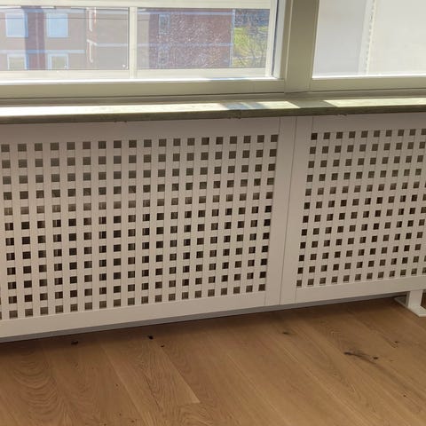 Mio sänggavel i vitmålat trä med stående spjälpanel. Klassisk, räfflad design som passar till sängar mot vägg. Sänggaveln står på ben och täcker en större del av väggen bakom sängen. Mindre märken och slitage kan förekomma enligt bilderna.