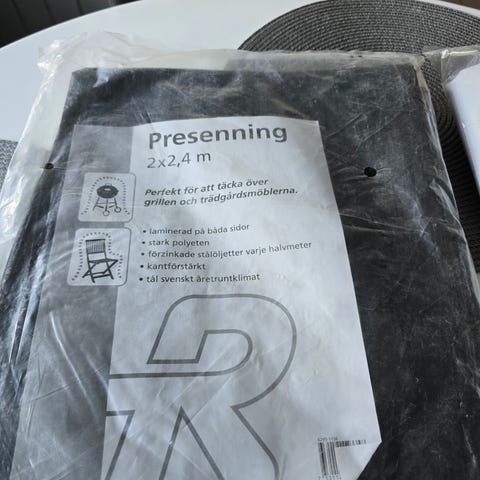 Försedd med öljetter. Presenningen är UV-skyddad. Sparsamt använd och fri från skador.