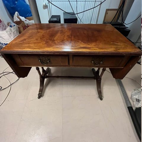 Superfint och detaljerat skrivbord, lädret på bordsskivan är torrt och skrivbordet är antikt, troligen från 1910. Inköpt på auktion.
