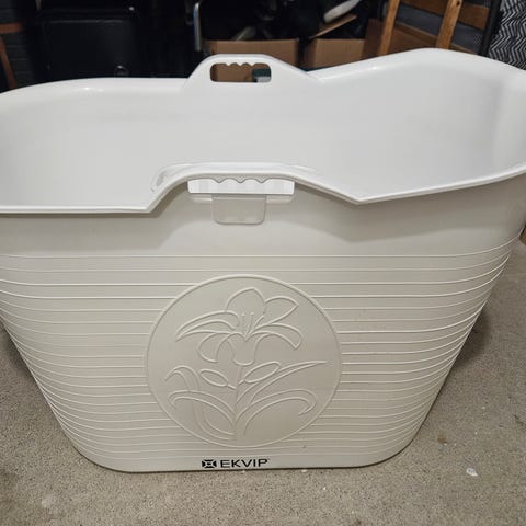 Badbalja i plast. En vuxen får plats. Avlopps rör i plast medföljer. Urtappning för vattnet i nederkanten.