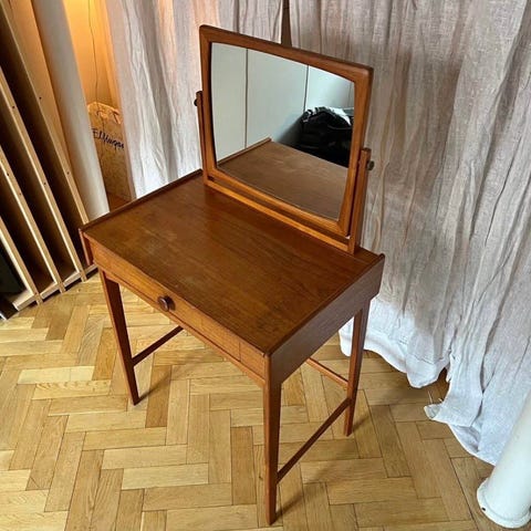 Spegeln i Eriksmålaglas (Belg. Maskinglas kval. AA) med infällda glasdetaljer har lampa med glaskupa och är 98 x 46,5 cm. Bordet med en låda samt ett hyllplan är 58 x 31 och 51 cm högt. Bara spegeln är värderad till 1000 kr. Säljs nu tillsammans med bordet för endast 500 kr.