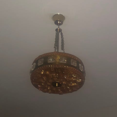 Klassisk och eftertraktad taklampa designad av Paul Kedelv, ofta kallad “Ufo-lampa” tack vare sin karakteristiska form. Lampan har vackert mönstrat glas i varm ton och detaljer i mässing som ger ett elegant retrointryck. En riktig designklassiker som passar perfekt i både moderna och vintageinspirerade hem.
