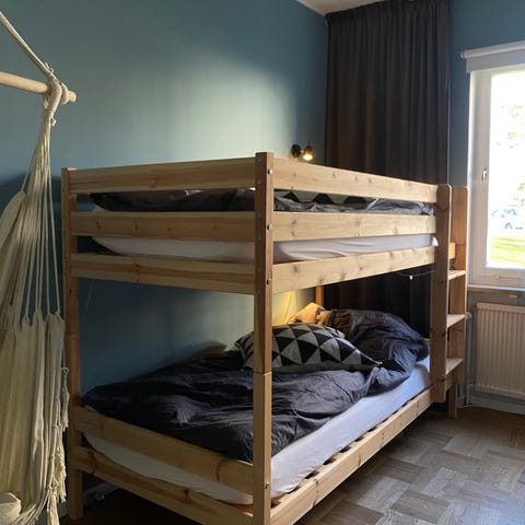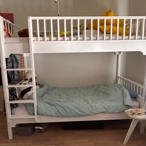 Om sängen: Svanenmärkt, TÜV-certifierad, FSC-trä, vattenbaserad lack utan skadliga ämnen. Sänghäst runt om på övre våningen.