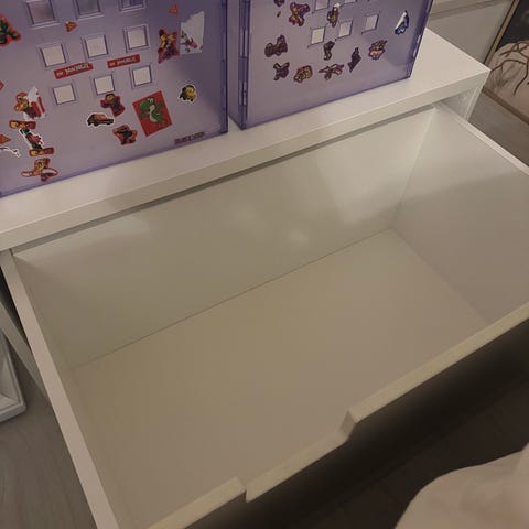 IKEA förvaringsmöbler med lådor i vit och grön färg. Möblerna består av en modul med öppen fack upptill och utdragslåda nedtill och en modul med två lådor. Passar för förvaring i barnrum eller andra rum där extra förvaringsutrymme behövs. Ytskikt i slät, lättskött material. Lådorna har urtag för grepp framtill för enklare öppning och stängning. Som bilderna visar finns små repor och en liten fläck i ena lådan. Säljes för 200kr/styck