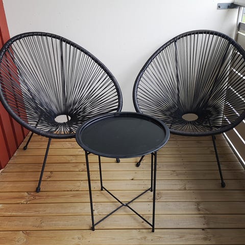 Utemöbelgrupp bestående av en soffa och två fåtöljer i svart färg. Stomme i metall med sits och rygg i spända snören som ger ett luftigt uttryck. Passar för uteplats, balkong eller altan. Dynor och annan textil tillhör inte.jysk ubberup modellen.
