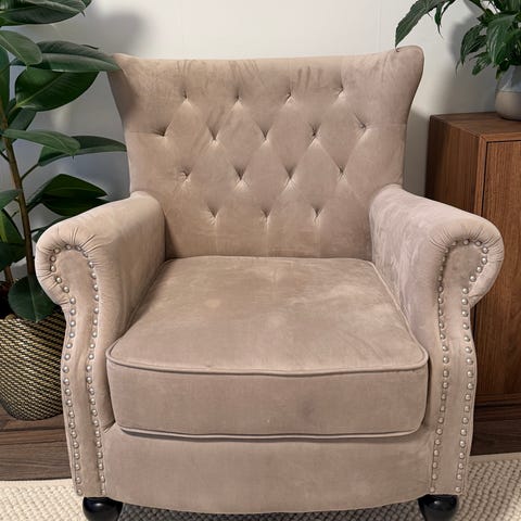 Fåtöljen är i bruksskick med visst slitage (se bild), men fungerar bra.