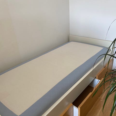 IKEA resårmadrass med grått tygöverdrag. Madrassen har en vit liggyta och sidor i grått, melerat tyg. Undersidan visar ett rutmönstrat stöd med ribbor och tygpaneler. Passar som liggdel i sängram eller på sängstomme med ribbotten. Hårdhet är medium hård. Det finns en eventuell lite fläck på den. Men tyget kan tas bort och tvättas.