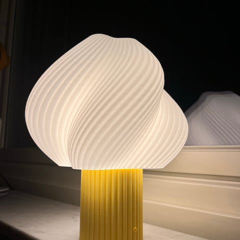 Mushroom lampa i glas. Lampan har en vit och grå virveldesign. Den är 19 cm hög och 15 cm bred.