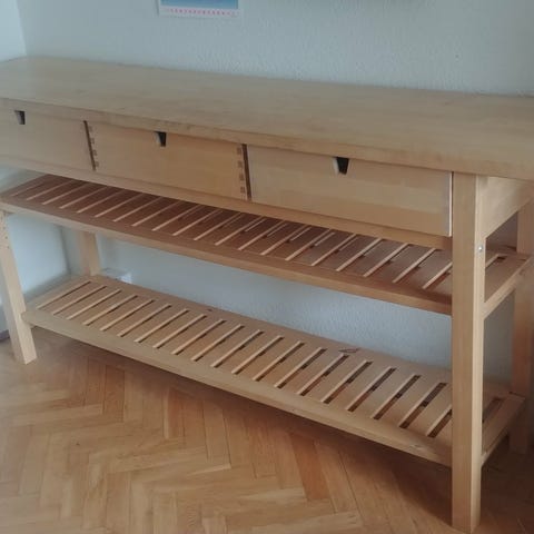 Byrå/Avlastningsbord. Trä med avtagbar glasskiva. Stått på balkong ett par.