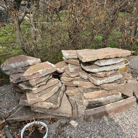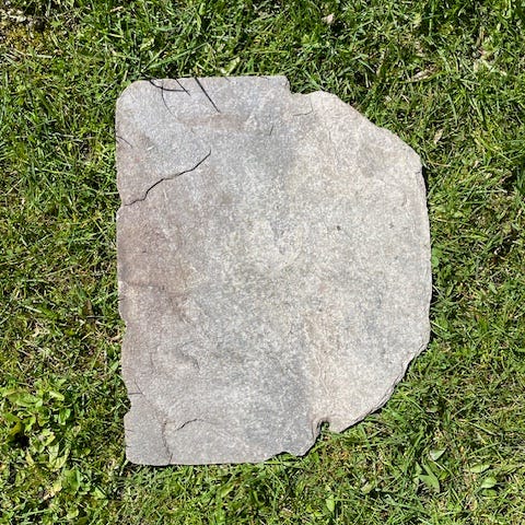 Ölandsstenar som som har använts som markstenar. De större stenarna är ca 60 x 30 cm2. Tjocklek varairer något och max tjocklek ser ut att vara ca 7 cm.