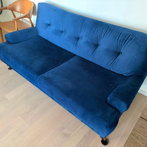 Säljer min mörkblå soffa, säljer den till ett bra pris då höger fram fotstöd har spruckit ( se bild 3), samt en av tvärstommen i botten är lagad. Inget som är kännbart. Avtagbar klädsel på dynorna.