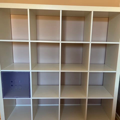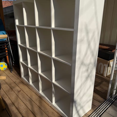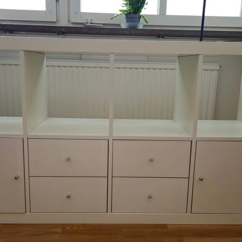 Vit hylla från IKEA modell Expedit med 2 lådinsatser med två lådor vardera. Äldre modell av Kallax. Kan ställas stående.
