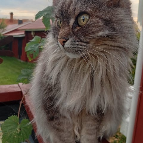 Bulten är en något pompös, men ändå charmig blandkatt som älskar att ligga utsträckt på rygg till. Han är en blandning av Norsk skogskatt och Main coon, med en nypa bondkatt i sig.