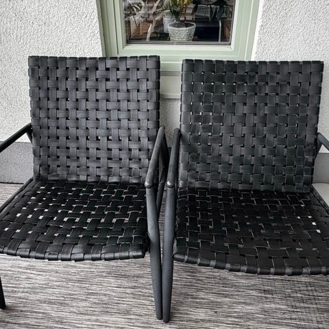Utemöbel stolar i svart konstrotting med grå sittdynor. Stolarna har armstöd och hög rygg i flätad design. Mått per stol: bredd 61 cm, djup 65 cm, höjd 92 cm. Sitsbredd 44 cm, sitsdjup 44 cm och sitshöjd 45 cm. Testad för en maxvikt på 110 kg enligt uppgifterna på bilden. Passar för uteplats, balkong eller trädgård.