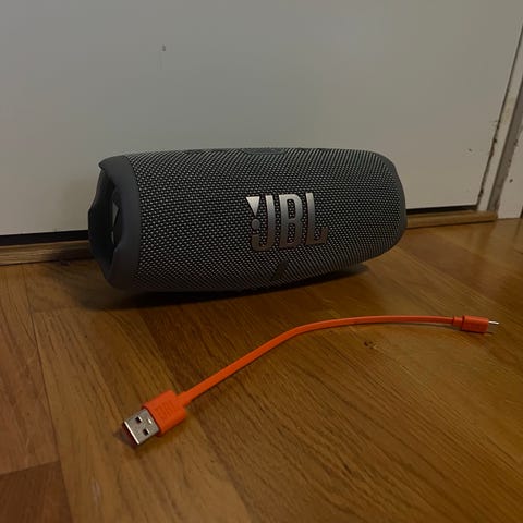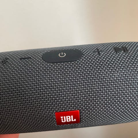 JBL Xtreme bärbar högtalare i svart färg. Modellen är utformad för trådlös uppspelning via Bluetooth och har integrerade knappar för volym, uppspelning och Bluetooth-anslutning på ovansidan. Högtalaren har tygklädd utsida och bäröglor i metall i båda ändar för eventuell axelrem. På baksidan finns skyddad panel med anslutningar och reglage. Nätadapter/laddare ingår enligt bild. Passar för användning inomhus och utomhus där bärbar ljudåtergivning önskas.