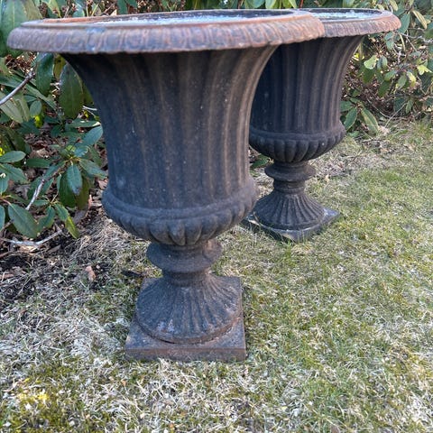 Krukor / urnor för utomhusbruk i ljus betongliknande material. Två stycken fristående i klassisk form, lämpliga för plantering av blommor eller mindre växter på altan, balkong eller i trädgård. Passar för användning året runt beroende på växtval och klimat. Bredd 35cm lilla och 45cm höga. Höjd 52cm och 58cm. 250kr st. Båda för 400kr