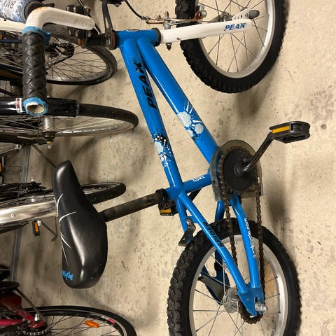 Barncyckel använd och stått ute men ändå i gott skick bara hoppa upp och trampa iväg. Lite luft i däcken så lite pumpning