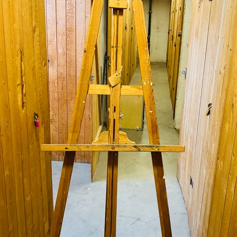 Staffli i trä. Fristående modell som kan användas för målning eller uppställning av dukar och skivor. Passar för användning i hem, ateljé. Justerbar konstruktion som ger stöd åt målarduk eller annan bildyta.