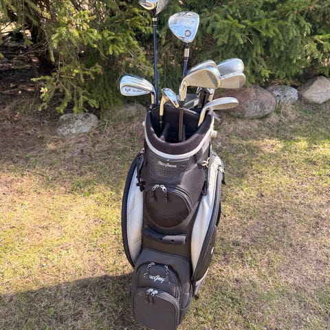 Vintage MacGregor golfset med snygg blå/vit bärbag. Innehåller järnklubbor 5–9, wedge samt 5-wood.