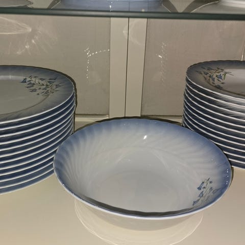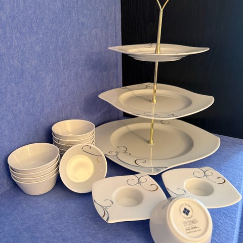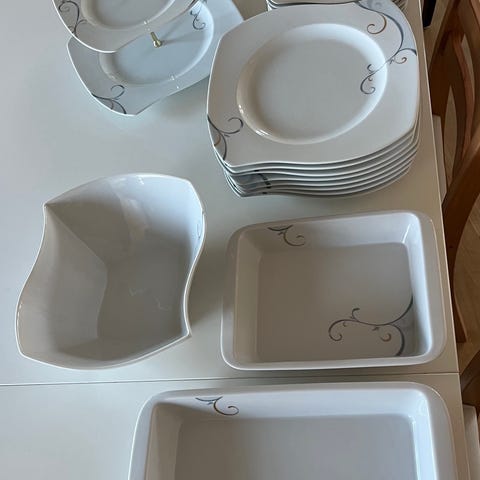 Säljer en fin servis från Figgjo Flint, modell Sonja Anniversary 2018. Klassisk vit design med vågig kant, diskret grönt blommotiv och elegant guldkant.