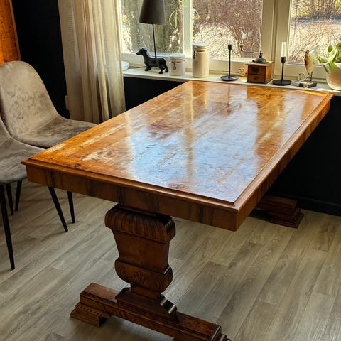 Matbord i trä i mörkbrun färg. Rektangulär bordsskiva med dekorativ kant och kraftigt utformat underrede med två benpar och tassformade fötter. Passar som matbord eller större sidobord i matsal eller vardagsrum.