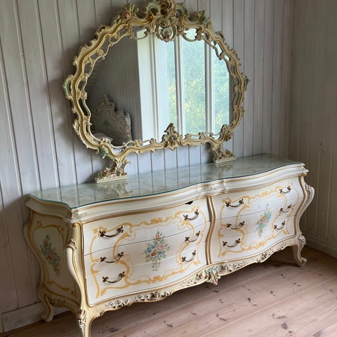 Vacker garderob från italienska Silik, en ikon inom klassisk möbeltillverkning. Denna unika möbel är tillverkad med unika detaljer och hantverk i världsklass. Vackra handskurna ortnament, skulpterade former och handmålade detaljer. Ett konstverk. Möbeln har stått i ett gästrum och är därför sparsamt använd. Nypris ca 80000kr. Säljes pga flytt. Finns även en byrå med spegel och stol, se separat annons.