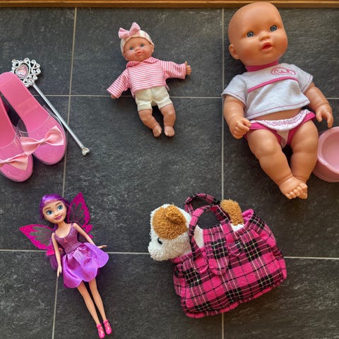 Barbie dockor med flera olika klänningar och tillbehör. På bilden syns en samling dockor i olika stilar samt flera lösa klänningar i olika färger. Passar för lek och rollekar med Barbie-figurer. Kläderna är avsedda för Barbie-dockornas storlek och kan kombineras på olika sätt.