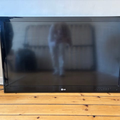 LG TV i vit färg med platt skärm och fristående fötter. Passar för placering på TV-bänk eller liknande yta. Anslutningar och exakta mått framgår inte av underlaget och kan kontrolleras på enhetens baksida eller i manual om den finns kvar.