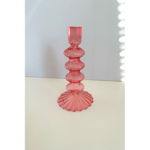 Superfin lila / rosa ljusstake i glas med vågig, ribbad design och rund fot. Ljusstaken har en modern look och är perfekt som inredningsdetalj. Passar för vanliga stearinljus och ger ett stilrent intryck i rummet. Ca 23cm hög. Mycket gott skick, som ny!
