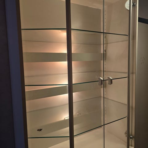 Bestå golvskåp med glasdörrar och två glashyllplan samt ett trähyllplan.