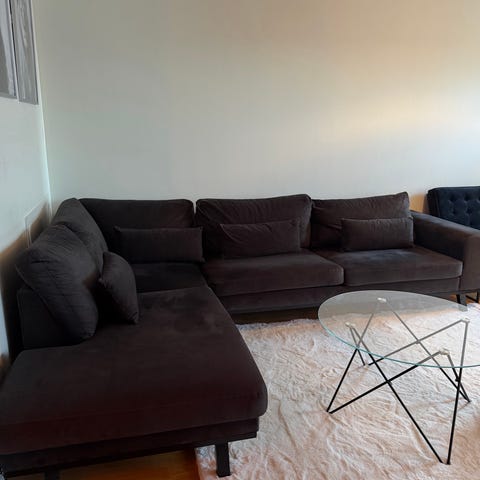 IKEA 3 sitssoffa med schäslong i svart läder. I nästintill nyskick. Soffan har sits- och ryggdynor med knapptuftad design och raka armstöd. Ben i metall ger ett modernt uttryck och lyfter soffan från golvet. Hörnutförandet med schäslong ger extra liggyta och passar för vardagsrum där man vill kombinera sitt- och viloplats. Formgiven av Alfred Homann. Kontinuerligt behandlat lädret. Mått se bild. Inköpt nov 2023. .10 års garanti.