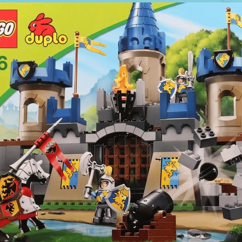 Lego Duplo borgar och piratskepp byggset. Innehåller delar för att bygga flera olika borgar och piratskepp, med murar, torn, portar, kanoner, segel och flaggor. Setet består av stora Duplo-klossar anpassade för yngre barn. Passar för lek med riddare, pirater och fantasifulla äventyr i både borg- och sjömiljö.