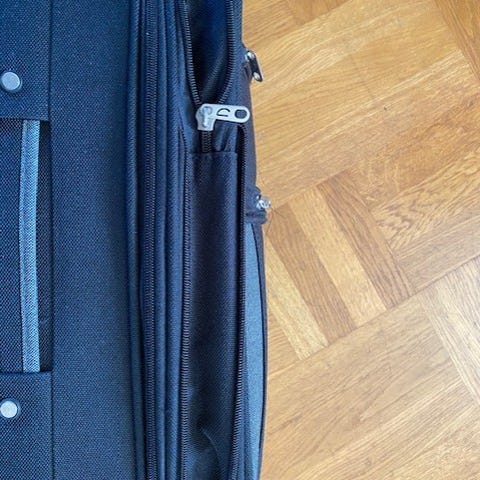 Säljer en stor svart resväska från Cavalet med två framfickor med dragkedja, bärhandtag och hjul för enkel transport. Väskan är tillverkad i slitstark textil och har en klassisk, mjuk form. Perfekt för längre resor när du behöver mycket packutrymme. För båda 200:-