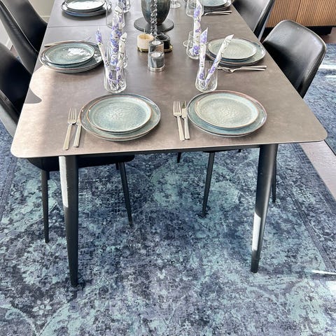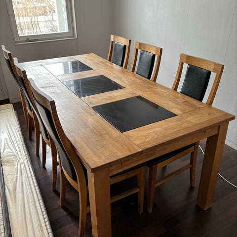 Matbord i massiv ek 180x90 cm med svart stenar i mitten + 6 stolar + glasskiva – Stabilt & prisvärt! (2 stolar med defekt sits). Köptes på Mio.