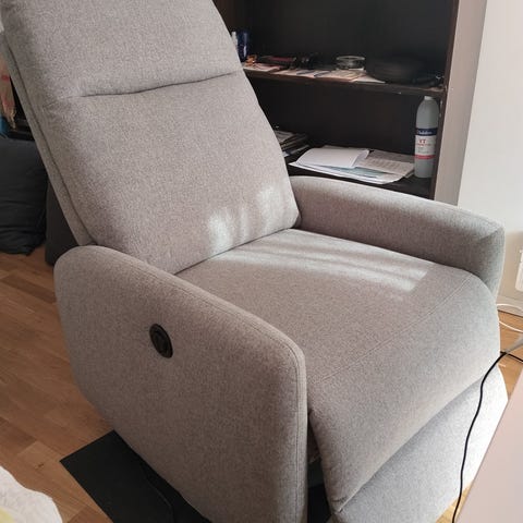 Fåtölj i grått tyg. Modellen har hög rygg med flera vadderade sektioner och stoppade armstöd. Sitsen är bred och djup för bekväm sittställning. Passar som läsfåtölj eller vilfåtölj i vardagsrum eller sovrum. Uppfällbara fotstödet fungerar inte