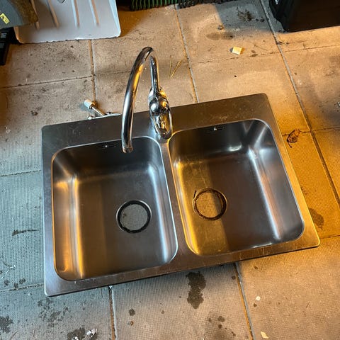 Diskbänk i rostfritt stål med blandare. 140 cm.