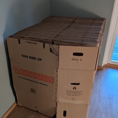 46 stycken flyttkartonger, blandat mellan främst Hornbach, Bauhaus och Clas Ohlson. Bra skick. Finns även två sopsäckar med tidningspapper som vi använde i samband med flytten om det är av intresse (gratis). Säljer alla i ett paket. Finns att hämta vid Järstorp.