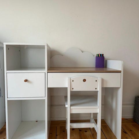 Skrivbord och stol för barn från Ferm Living Little Architect serien, färg cashmere. Fint skick, har nån liten skada och fläck på bordskivan i övrigt mycket fint skick.