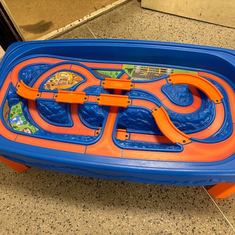 Rolig bilbana som byggs ihop, leksaksbil med drivmotor som åker runt snabbt. Bilkåpa i olika färger. Barnen tycker den är jätterolig men nu blivit större.