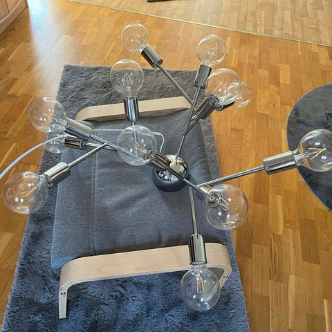 Säljer nu denna fantastiska taklampa som garanterat blir rummets mittpunkt! Det är en modern och lyxig ljuskrona i krom med hela 21 ljuskällor, perfekt för dig som vill ha en industriell men samtidigt elegant känsla över matbordet eller i vardagsrummet.