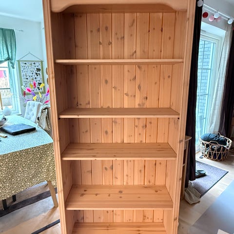 Bokhylla i brun träfinish med fem hyllplan (finns ett extra hyllplan - således sex totalt). Hyllplanen är justerbara i höjd med hjälp av sidolister med hål. Passar för förvaring av böcker, pärmar eller prydnadssaker i vardagsrum, arbetsrum eller sovrum. Placeras mot vägg och står på golv.