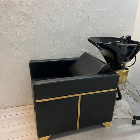Schamponeringen är klädd i slitstarkt fauxläder med mattsvarta detaljer och har ett ergonomiskt format ryggstöd som ger bra stöd för svanken – mycket bekväm för både kund och frisör.