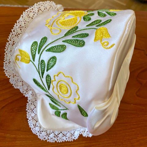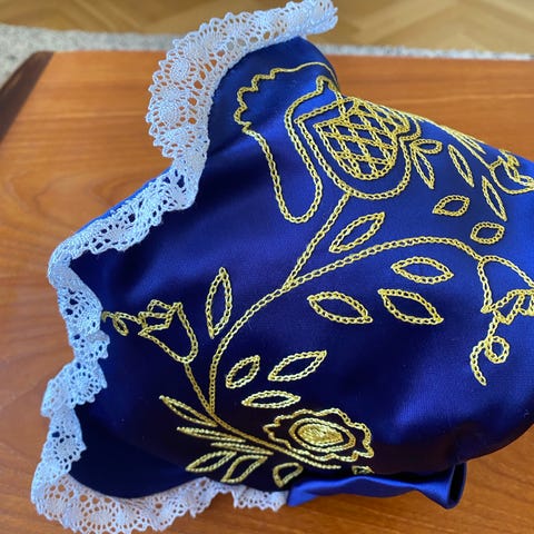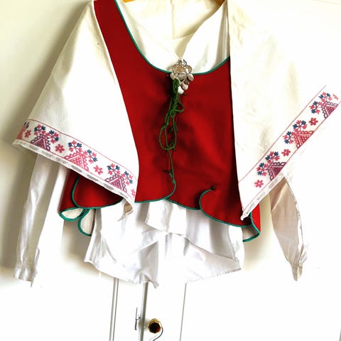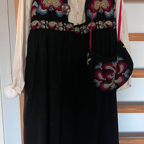 Folkdräkt sydd i slutet av 70-talet. Innehåller kjol, förkläde, linneblus, livstycke, sjal, brosch och bindmössa. Se mått och detaljer nedan.