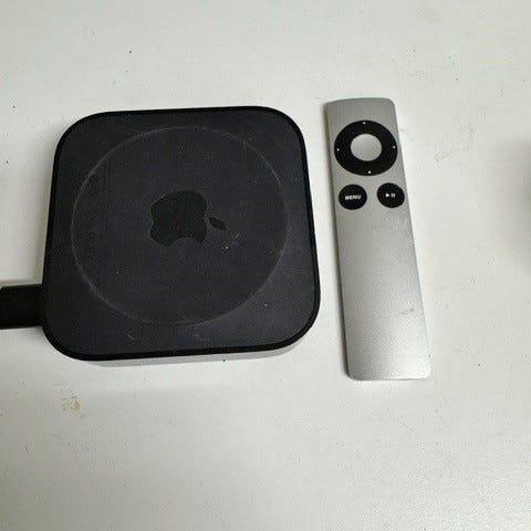 Apple TV gen 3 med fjärrkontroll, nätsladd och HDMI kabel