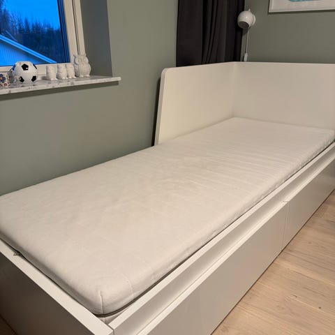 IKEA säng med förvaring i vit färg. Sängen har hög gavl och utdragslådor under liggytan som ger extra förvaringsutrymme för till exempel sängkläder eller kläder. Passar som enkelsäng i sovrum, gästrum eller tonårsrum. Madrass och sängkläder enligt bild