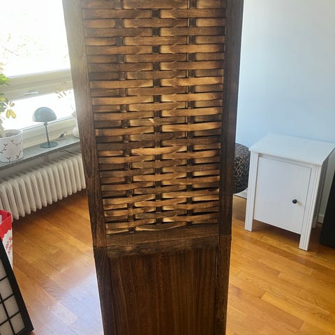 Vit vikskärm i trä och rispapper. 4 sektioner.