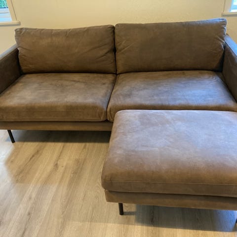 Jotex fotpall i rektangulär modell. Klädd i beige tyg/läderliknande material med synliga sömmar upptill och svarta metallben. Passar som fotpall eller extra sittplats i vardagsrum eller sovrum. Undertyget har några revor, vilket syns på bildens undersida. Övriga mått och materialspecifikationer framgår inte.