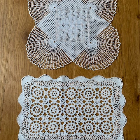 Virkad duk i fyrkantig modell. Duken är vit och har ett genombrutet mönster med blommor och rutor. Passar exempelvis som bordsduk, sidobordsduk eller dekorativ textil i hemmet.