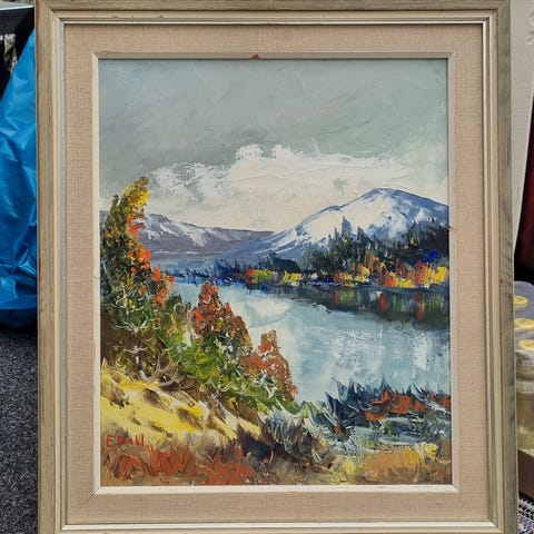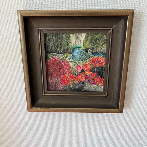 Målad tavla med abstrakt landskapsmotiv föreställande träd i gröna och blå toner. Verket är utfört med kraftiga penseldrag och strukturerad färgyta. Färgerna domineras av olika nyanser av grönt, turkos och ljusgult. Tavlan är inramad med en enkel ram. Passar som väggdekoration i exempelvis vardagsrum, hall eller kontor.