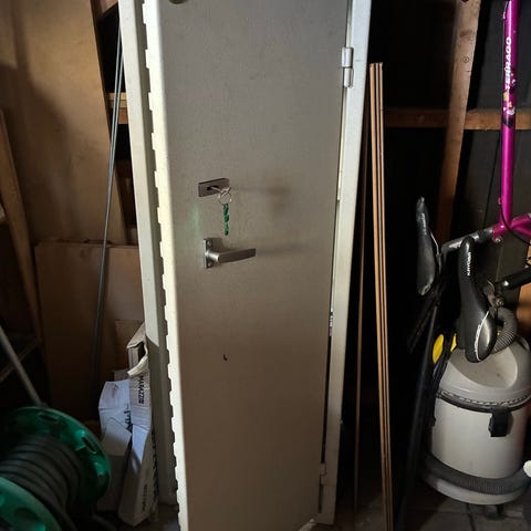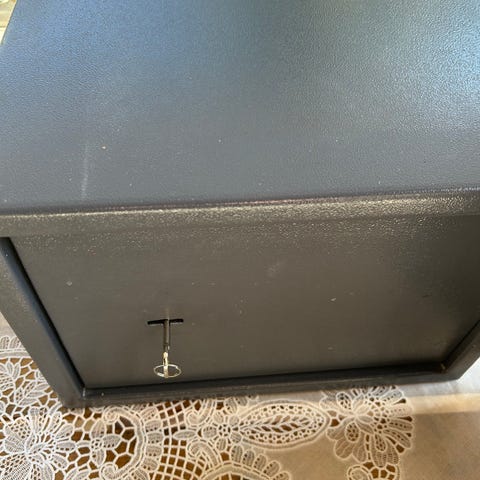 Arbrå kassaskåp i grönt metallutförande. Skåpet har en dörr med vred och nyckellås samt flera låspunkter i dörrkanten. Invändigt finns hyllplan för förvaring samt en separat låsbar innerlåda med handtag. Passar för förvaring av värdesaker, dokument eller annan utrustning där man önskar låsbar förvaring. Yttermått: ca 139cm högt, ca 57cm brett och ca 57,5cm djupt inklusive dörrgångjärn. Nycklar till både dörr och låda finns. Hämtas i Boliden, ta med bärhjälp.